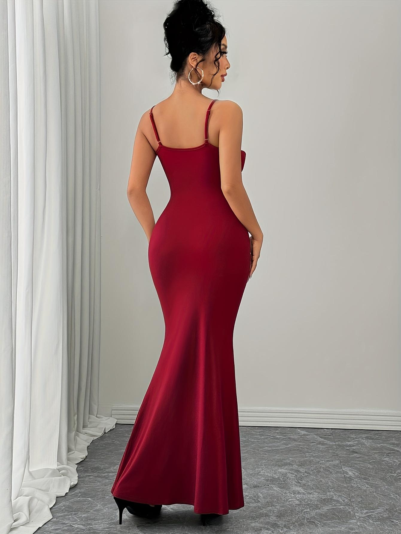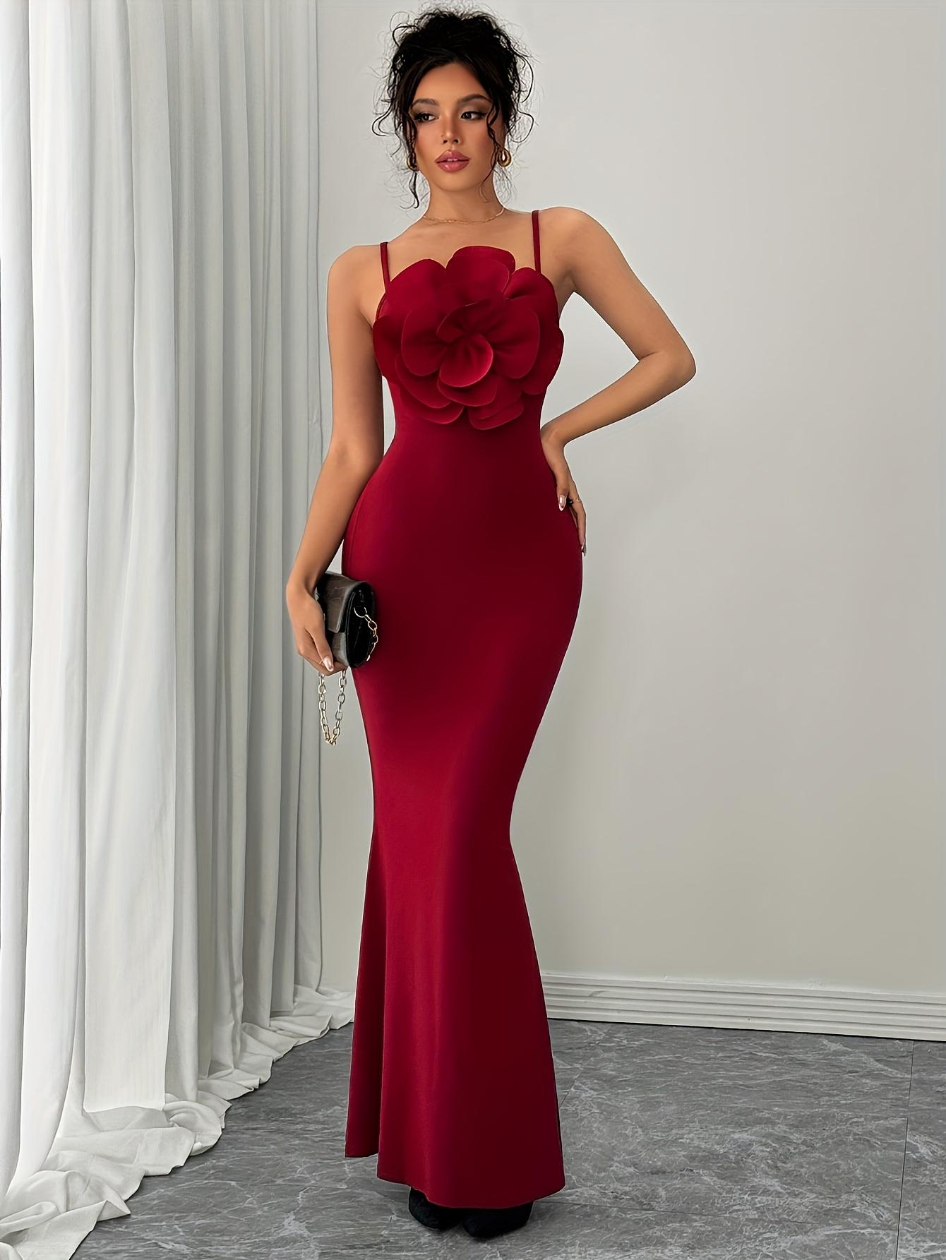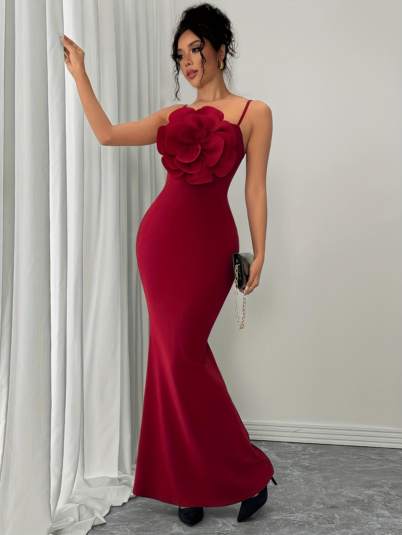 Robe moulante rouge à grand motif floral pour femmes, tendance et élégante | Col rond, couleur unie, convient à toutes les saisons.
