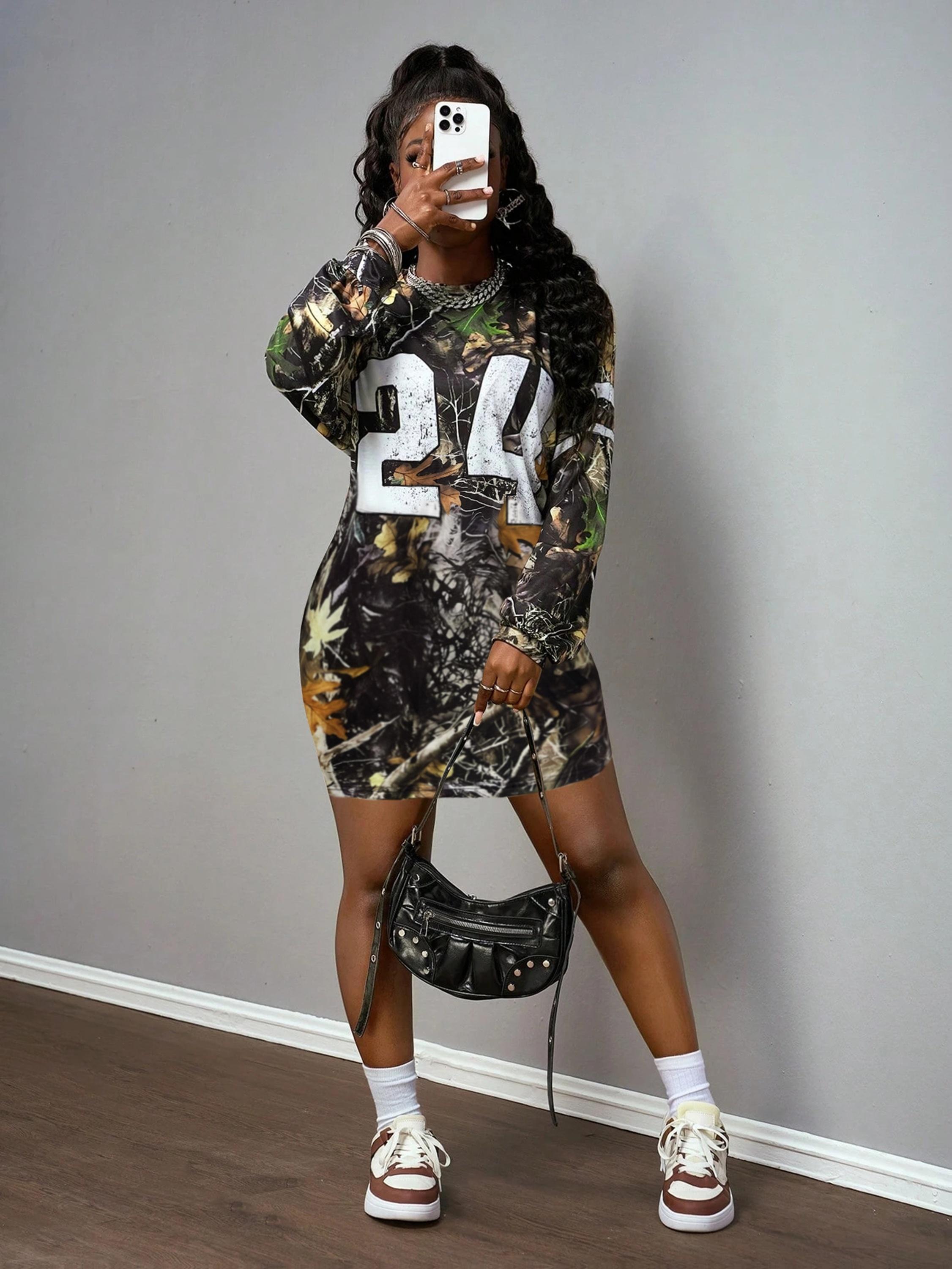 Robe T-Shirt Oversize Camouflage & Numéro 24 - Motif Feuille Verte/Marron & Camo Blanc, Col Rond Longueur Courte à Mi-Longueur, Coupe Décontractée Toutes Saisons, Lavable en Machine pour Chasse, Fêtes, Tenue Décontractée (Non)