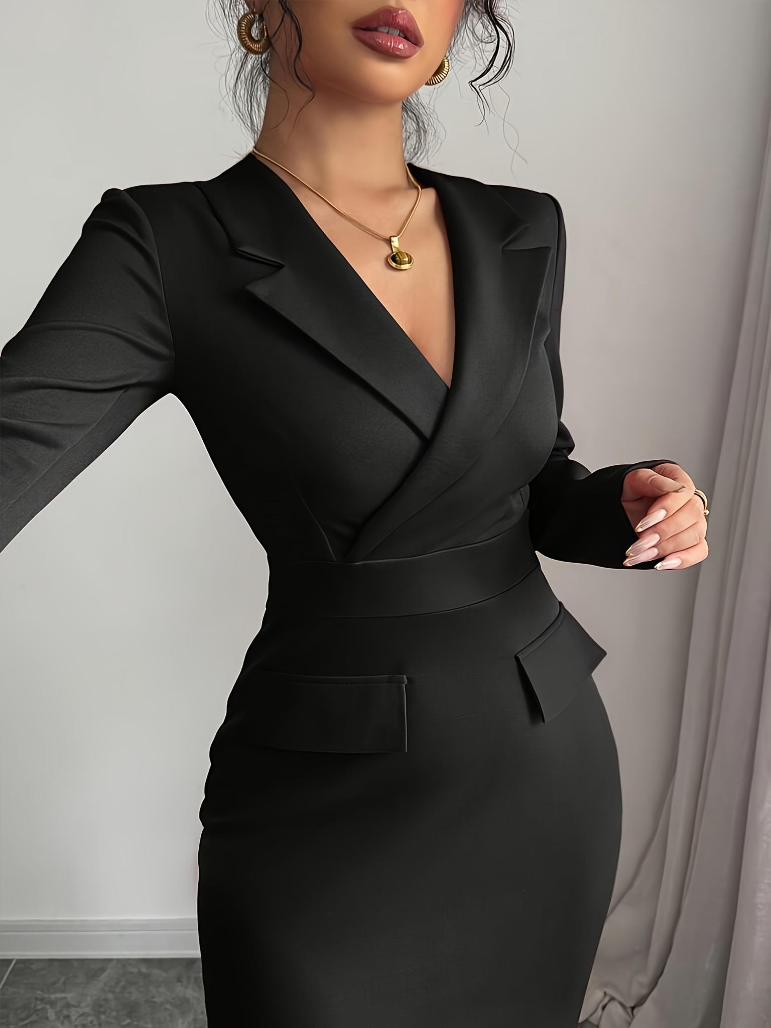 Robe Élégante et Simple à Col de Costume Noir Manches Longues pour Femme, Jupe Polyvalente Tendance Dames, Tenue Confortable Moulante Féminine Pour Quotidien/Dates/Soirées ou Occasions Professionnelles, Rôbes Mi-Longues Chic Pou