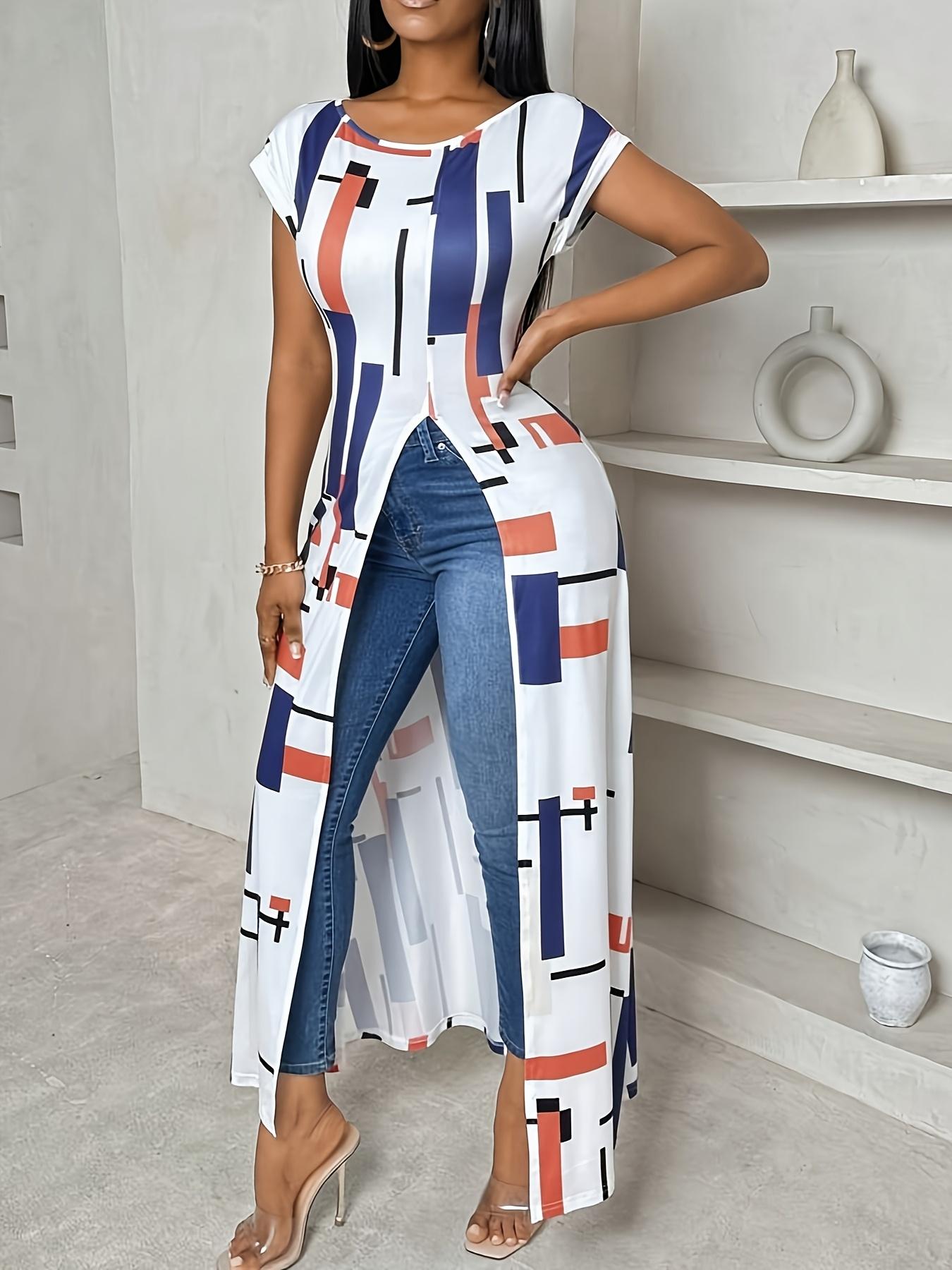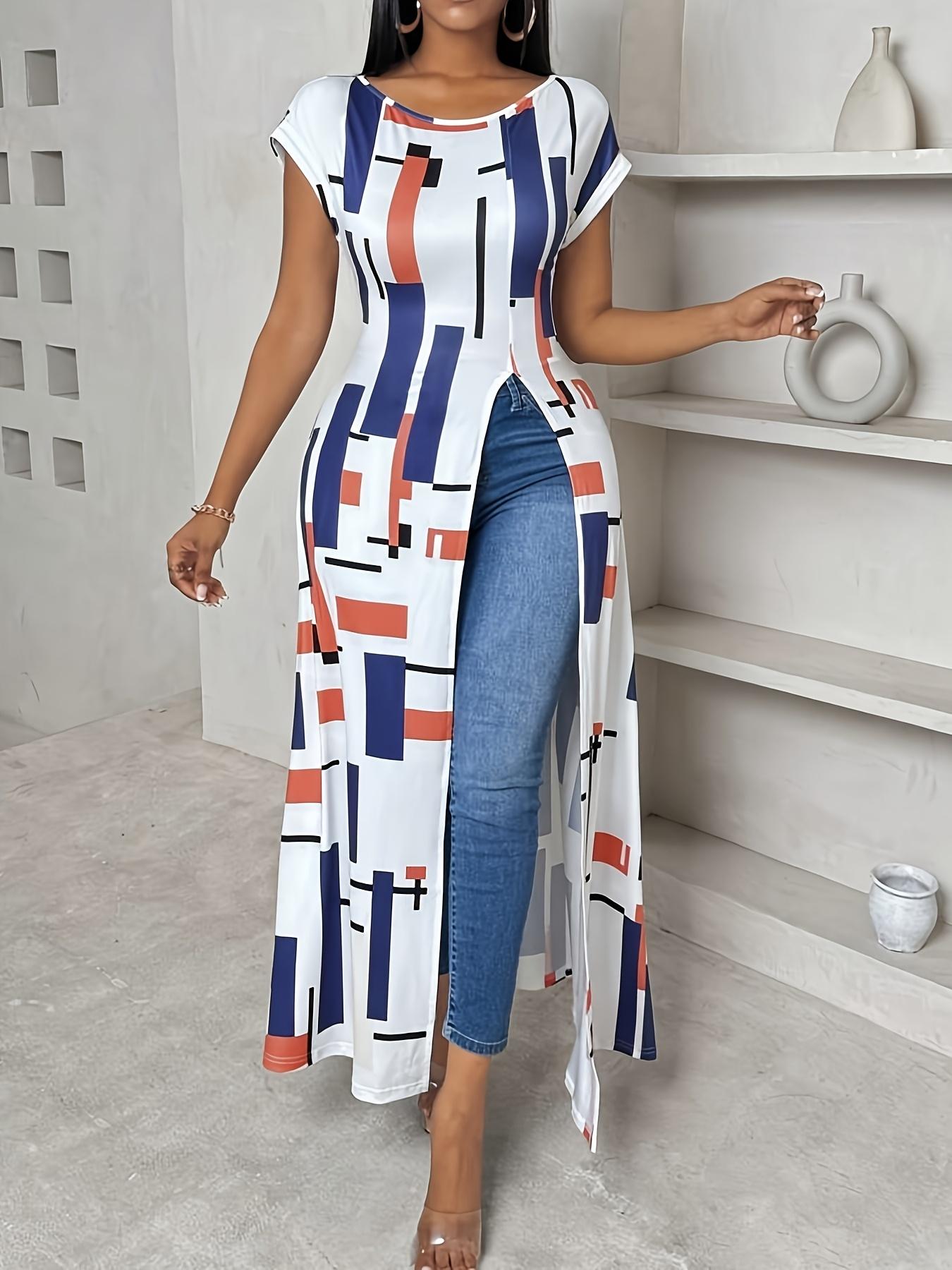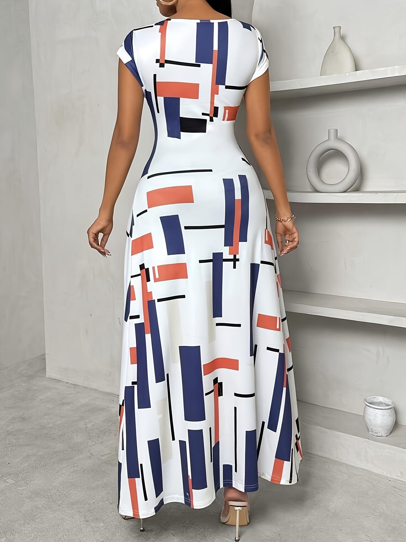 Robe Élégante Zhou Meiling à Imprimé Géométrique pour Femme - Col Rond, Manches Courtes et Fente Haute, Lavable en Machine, Robe Décontractée ou Semi-Formelle Printemps/Été, Tissu Respirant, Mode Estivale, Non Transparent, Tenue Tendance