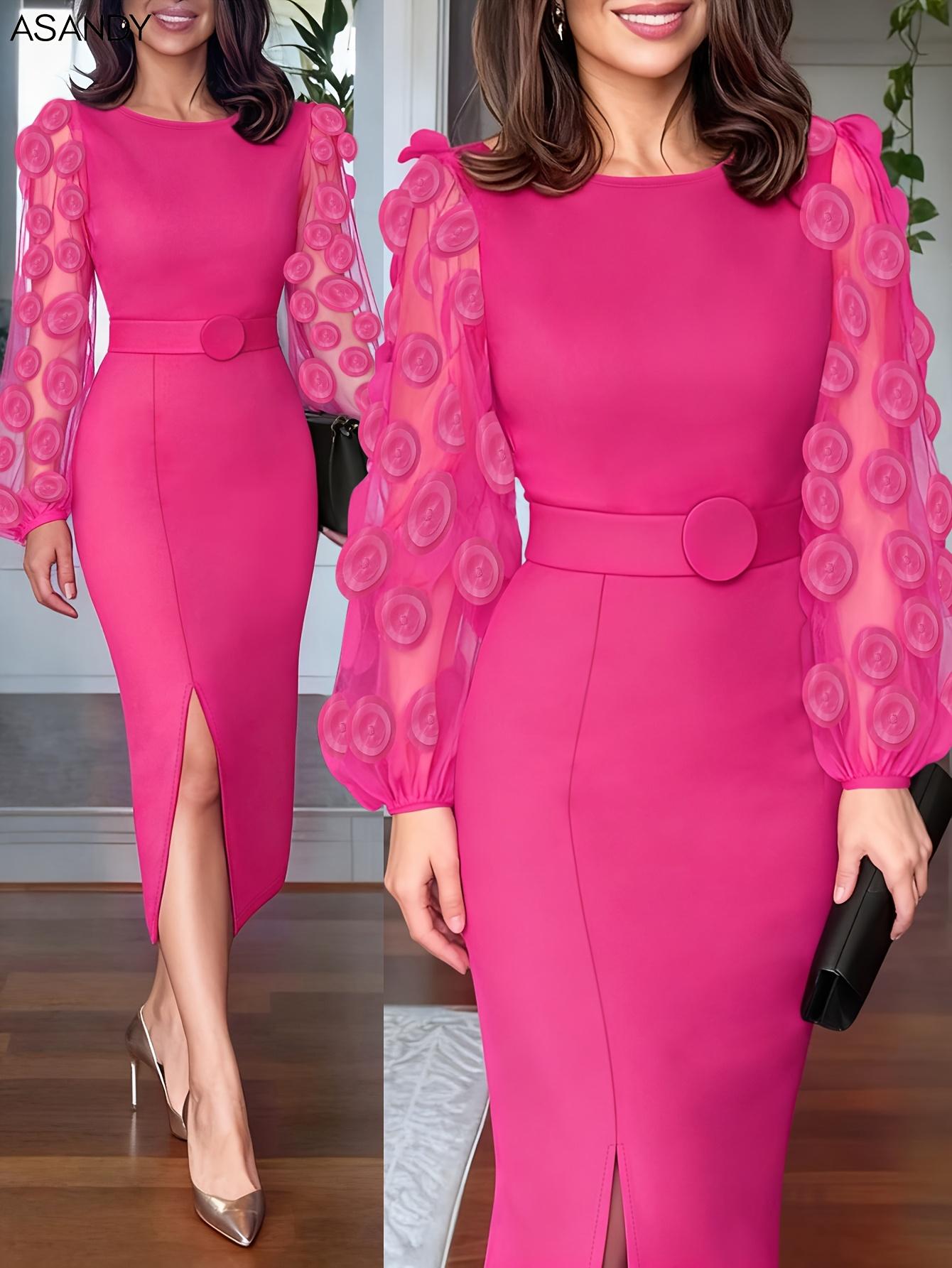 Robe sirène à ourlet fendu en A pour femme avec filet pétale et manches courtes - Coupe ajustée unie à col rond et boutonnage devant, lavable en machine, robe de fête pour mariage, invité, printemps, été, automne (superposition florale, non)