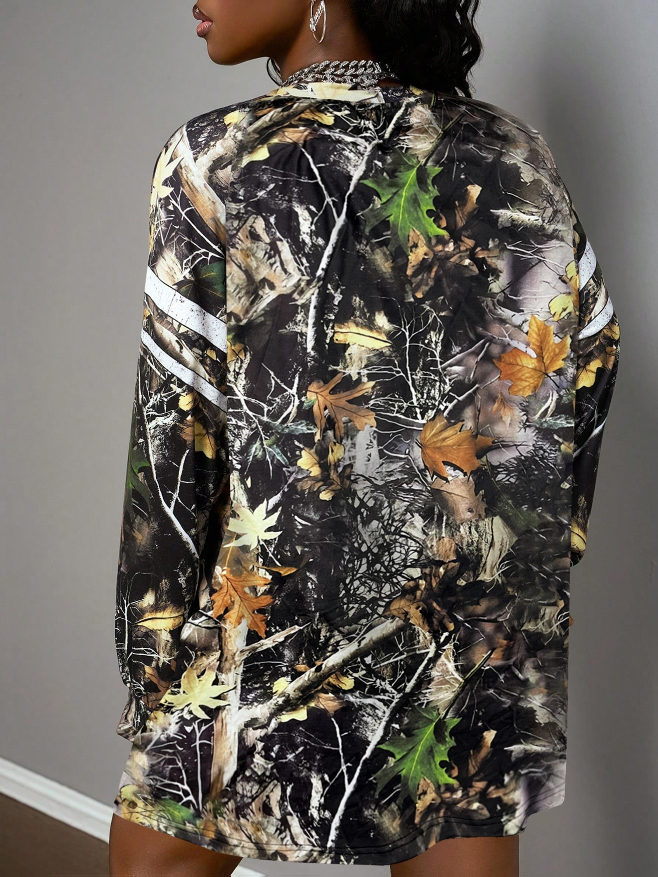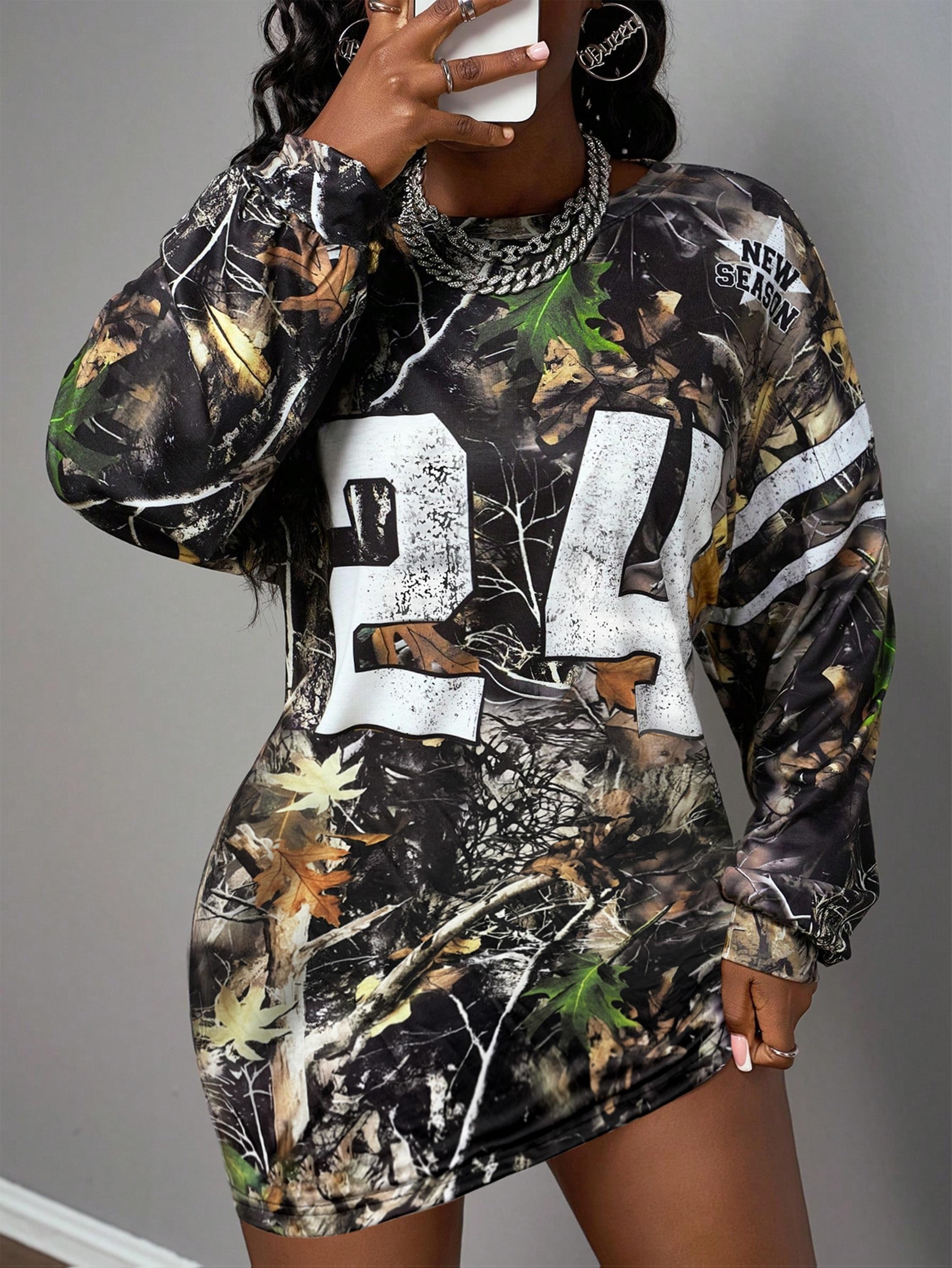 Robe T-Shirt Oversize Camouflage & Numéro 24 - Motif Feuille Verte/Marron & Camo Blanc, Col Rond Longueur Courte à Mi-Longueur, Coupe Décontractée Toutes Saisons, Lavable en Machine pour Chasse, Fêtes, Tenue Décontractée (Non)